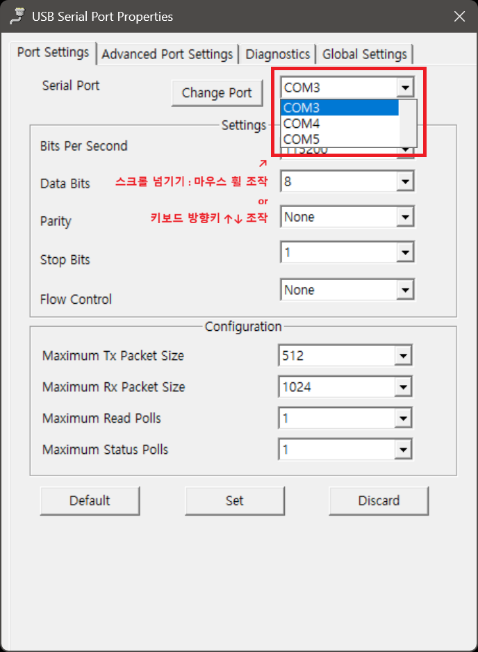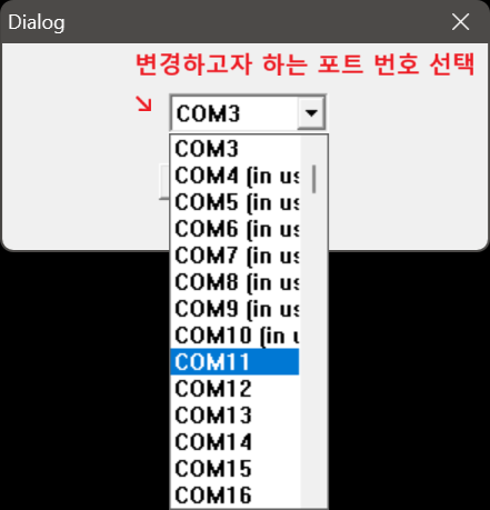 4) 해당 드롭다운 메뉴에서 마우스 휠을 조작하거나, 키보드의 방향키 중 ↑, ↓ 키를 조작해서 원하는 COM 포트 번호로 커서를 이동시킵니다.