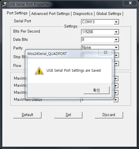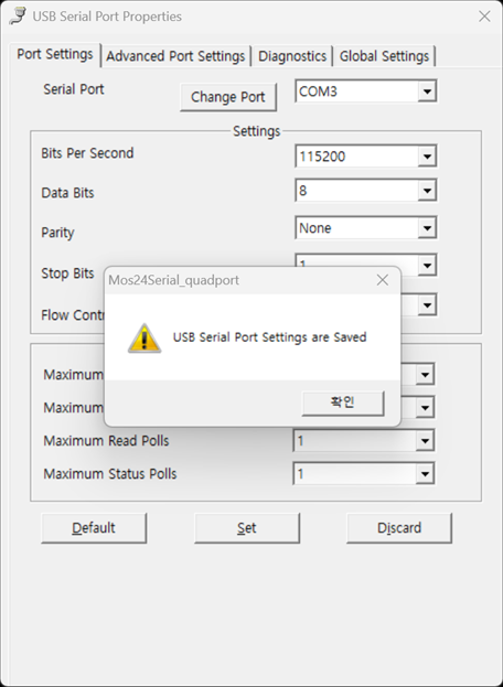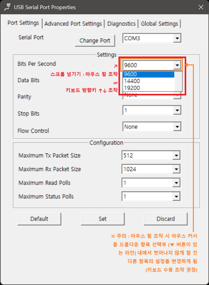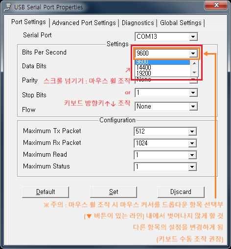 ⓑ Serial Port : 현재 선택된 COM 포트의 번호입니다. 해당 포트 번호를 선택하고 설정을 변경하면 해당 COM포트의 포트 설정값이 변경됩니다.