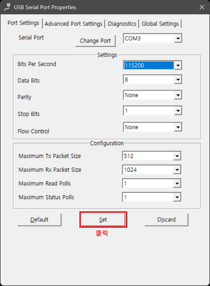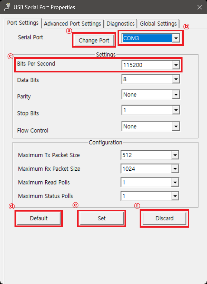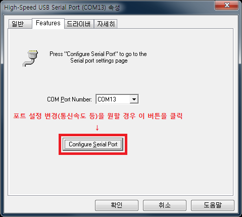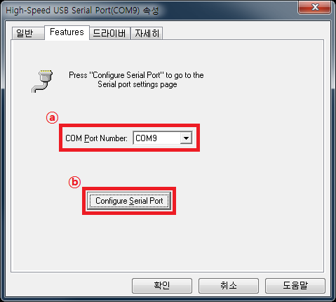 ⓑ Configure Serial Port : 포트 번호 변경 이외의 기타 포트 설정(속도 설정 등)을 하기 위한 설정 프로그램을 엽니다.