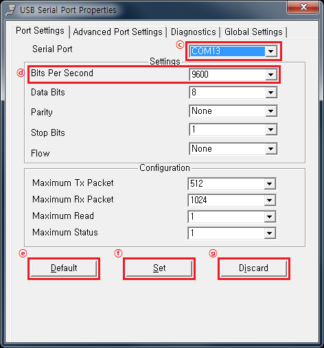ⓒ Serial Port : 현재 선택된 COM 포트의 번호입니다. 해당 포트 번호를 선택하고 설정을 변경하면 해당 COM포트의 포트 설정값이 변경됩니다.