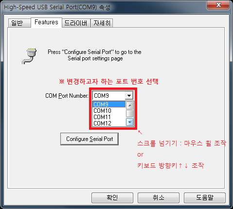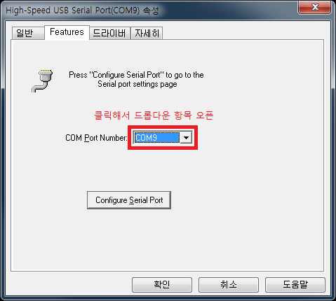 이후 'Features' 탭으로 변경, 여기서 'COM Port Number'의 드롭다운 항목을 열어서 원하는 COM포트 번호를 선택하고, '확인'을 눌러 COM포트 번호를 변경해줍니다.