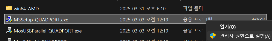 3) 압축을 해제한 폴더 내에 있는 [MSSetup_QUADPORT.exe] 파일을 [관리자 권한으로 실행]합니다.