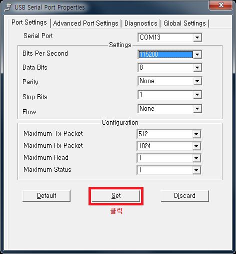 - 여기서는 COM13의 통신 속도(Baud Rate)를 기본값에서 115,200bps로 바꿔볼 것입니다.