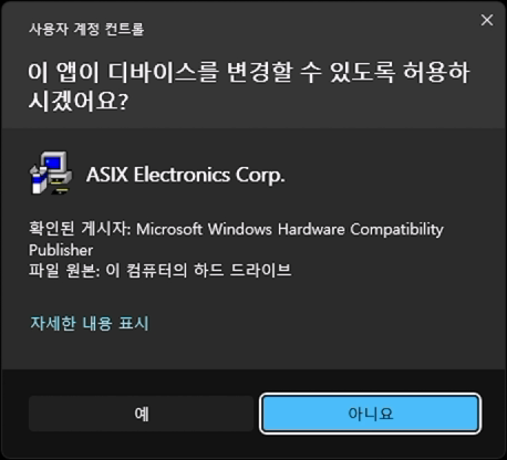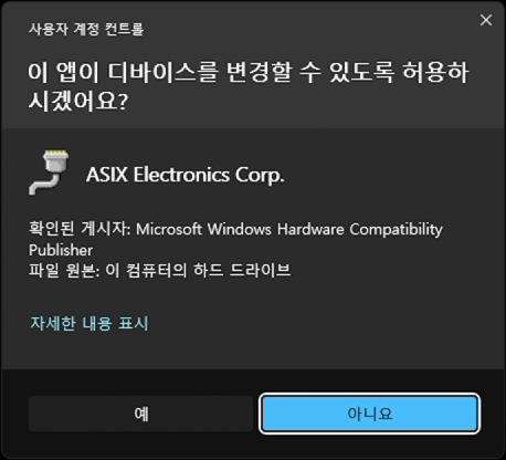 - 분리하지 않을 경우, 드라이버 설치 완료 이후 장치를 분리했다 다시 연결하거나, 재부팅 과정이 필요합니다.(드라이버 설치 과정에서 장치 재인식 과정이 별도로 없음)
