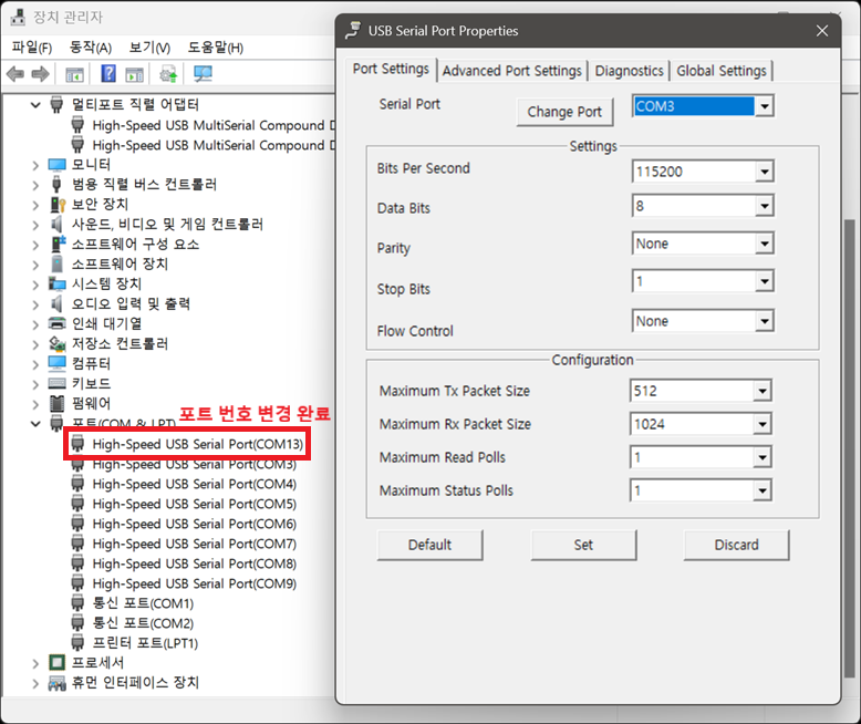 성공적으로 포트 번호가 변경된 경우 , [장치 관리자]에서 실시간으로 포트 번호가 변경된 것을 확인할 수 있습니다.