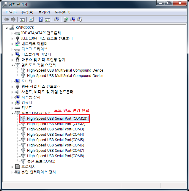 - COM2~9를 COM6~13으로 변경하려면, 가장 마지막 포트 번호인 COM9부터 COM13으로 변경, COM8은 COM12로 변경, COM7은 COM 11로 변경하는 식으로 가장 마지막 번호부터 순차적으로 변경해야 합니다.