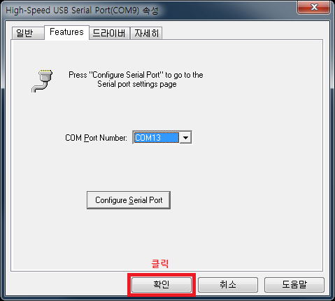 - 따라서, 여기에서는 [High-Speed USB Serial Port (COM 13)]를 선택하고 '속성'을 열어준 다음, 'Features' 탭으로 이동합니다.