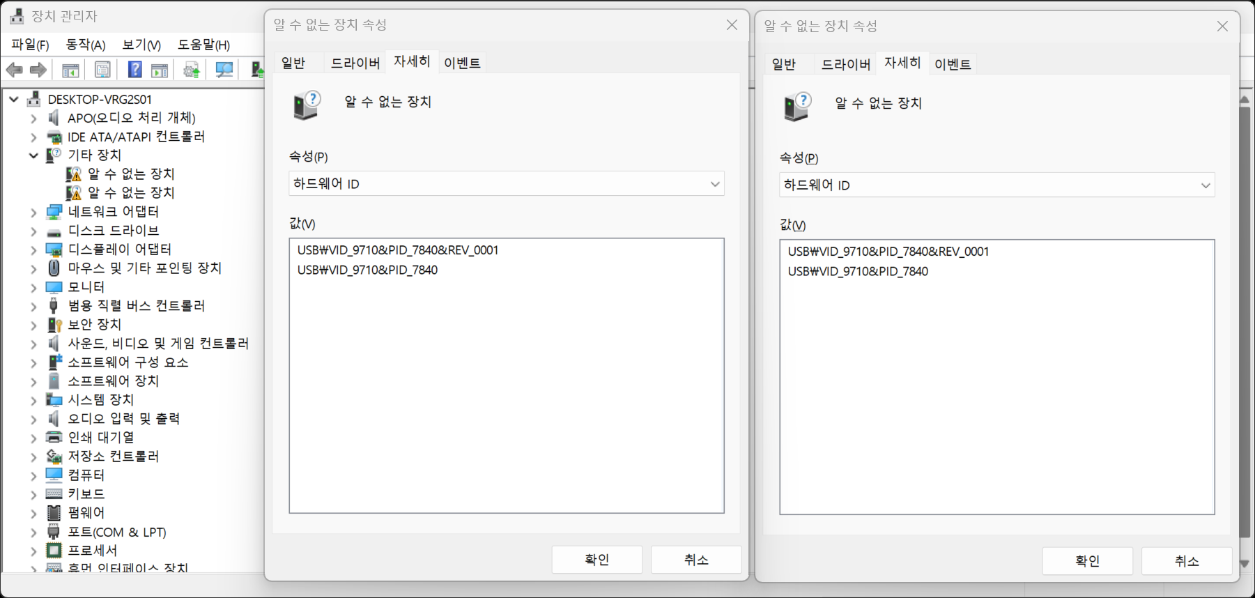 - [알 수 없는 장치]로 인식된 장치에 대한 하드웨어 ID