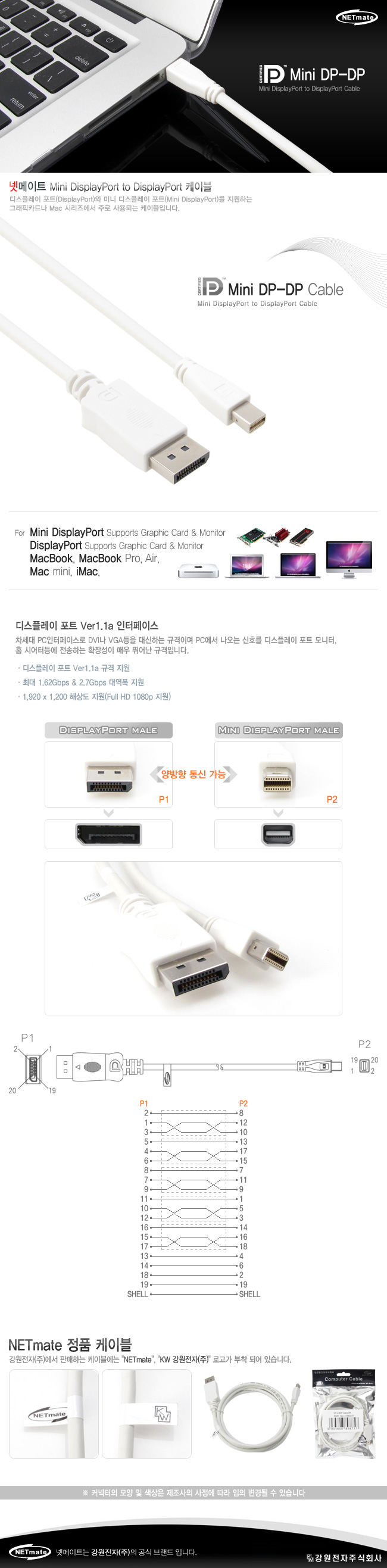 강원전자 넷메이트 NMC-MDP02 Mini DisplayPort to DisplayPort 케이블 2m NMC-MDP02