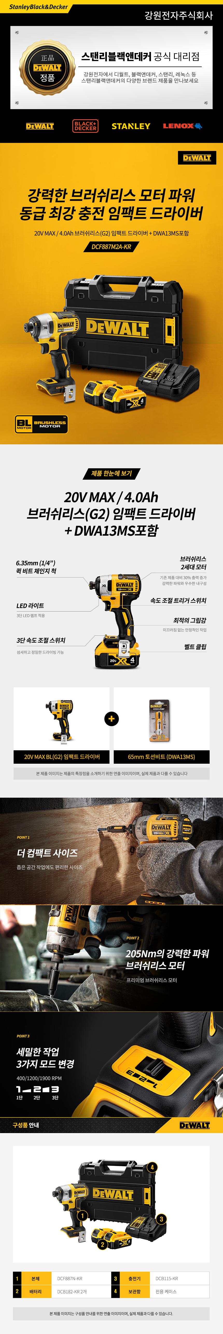 DCF887M2A-KR 20V MAX 충전 임팩트 드라이버 세트(4.0Ah 2팩 + 65mm 토션비트)