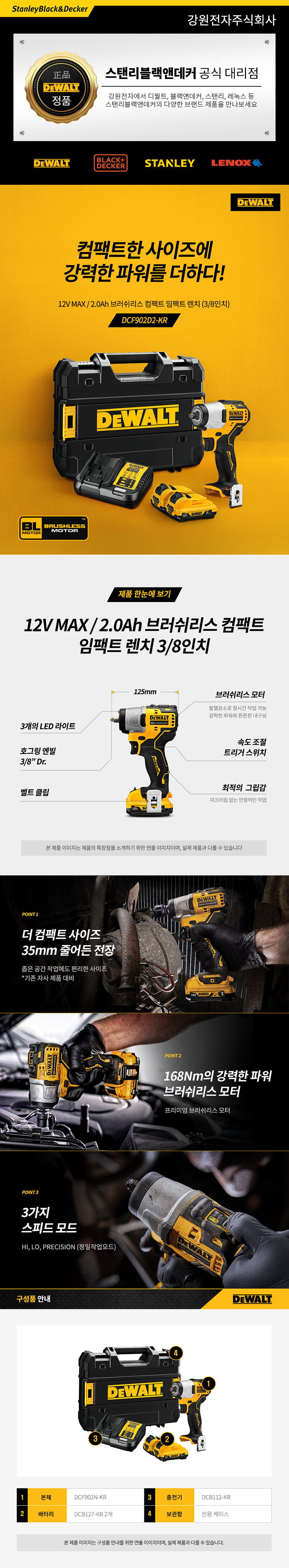 디월트 12V MAX 충전 임팩트 렌치 세트(2.0Ah 2팩) DCF902D2-KR DCF902D2-KR